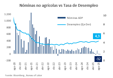 El mercado laboral mostró señales de debilidad: las nóminas privadas ADP registraron una caída de 32 000 trabajadores en septiembre, frente al aumento de 51 000 esperado.