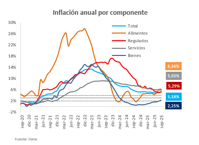 El Banco de la República mantuvo su tasa de interés en 9,25 % con una votación dividida. La inflación total se ubicó en 5,1 % y la básica en 4,8 %, ambas por encima de lo esperado, lo que sugiere una convergencia más lenta hacia la meta del 3 %.