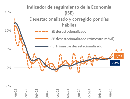 Sorprendió fuertemente al alza el crecimiento del Índice de Seguimiento a la Economía (ISE) con corte a julio. La actividad económica registró un crecimiento de 4.3% a/a en julio, superior al esperado por el promedio de los analistas de 2.6% a/a y del 3.0% a/a en junio. La principal fuente de la aceleración de la economía se dio principalmente por la recuperación del sector de “Actividades financieras y de seguros” que registró un crecimiento en el último mes, en contraste con la contracción observada el mes anterior. Adicionalmente, sectores como los de “Administración pública, defensa y artes”, “Comercio mayorista y minorista” e “Industria manufacturera y construcción” aceleraron su ritmo de crecimiento. En contraste, los sectores de “Agricultura, ganadería, caza, silvicultura y minas”, registraron una contracción en julio, deteriorándose desde el crecimiento en el mes anterior. En el trimestre móvil a julio el ISE aceleró de manera importante su ritmo de crecimiento hasta 3.2% a/a, superior al crecimiento de 2.5% en 2T25, cifra que, de consolidarse a lo largo de 3T25, podría sesgar al alza el crecimiento de 2.6% que esperamos para el consolidado del año.
