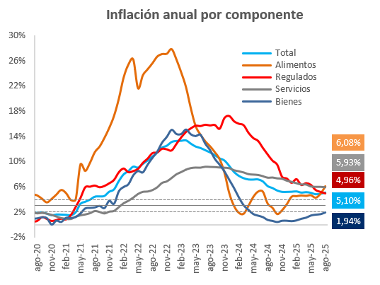 Más adelante, se conoció que la inflación del IPC se aceleró hasta 2.9% a/a, en línea con lo que esperaba el promedio de analistas, superior a la de 2.7% a/a del mes anterior. La aceleración anual se dio principalmente en los rubros de alimentos, energía y bienes transables, los últimos afectados por las decisiones arancelarias. La inflación núcleo que excluye los precios de los alimentos y energía, se mantuvo inalterada en 3.1% a/a en agosto, como lo anticipaba el promedio de analistas, gracias a una desaceleración de los precios de los servicios que compensó la presión al alza en los precios de los bienes transables.