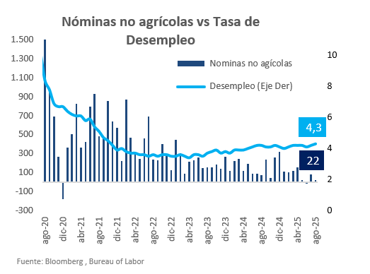 Deterioro del mercado laboral en EE. UU sustenta los recortes que se esperan de la FED. En contraste, en Colombia las presiones inflacionarias limitan los recortes