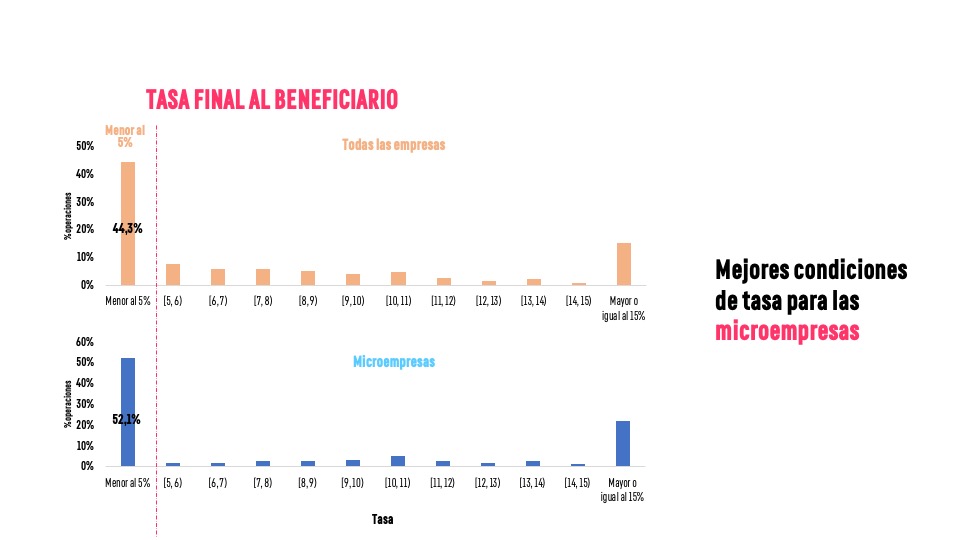 Queremos destacar el beneficio que tuvo sobre el empresario el compromiso de cobrar una tasa inferior. El 72,9% de las operaciones tuvo una tasa inferior al 10% E.A. Además, la proporción de microempresas que recibieron una tasa inferior al 5% fue de 52.1%, un valor mayor, comparado con el total de empresas.