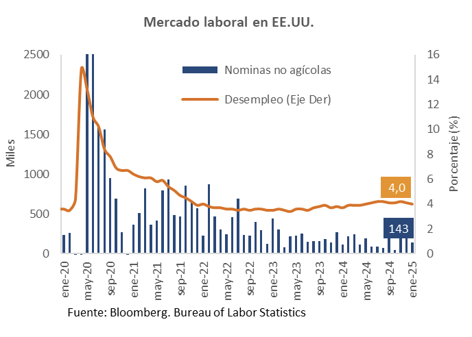 Más adelante se conocieron los resultados de mercado laboral con corte a enero. Las nóminas no agrícolas aumentaron en 143 mil en enero, por debajo de las 175 mil que esperaba el promedio de analistas y de las 307 mil el mes anterior. La desaceleración en el ritmo de contratación fue generalizada, aunque más marcada en los sectores de “tiempo libre y hostelería” y “servicios profesionales”. A pesar de la menor generación de nuevos puestos de trabajo, la tasa de desempleo disminuyó hasta ubicarse en 4,0%, en contra de la expectativa de estabilidad del promedio de analistas en la de 4,1% en diciembre y por debajo de la tasa de pleno empleo de 4,2%, lo que deja en evidencia la resiliencia del mercado laboral.