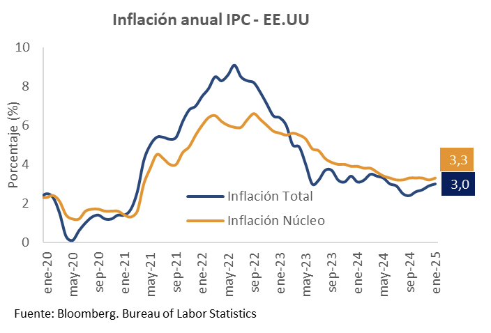 El anuncio de la imposición de aranceles del 25% a las importaciones provenientes de México y Canadá generó un fuerte incremento de la aversión al riesgo global, aunque su entrada en vigor se aplazó por un mes tras llamada con los mandatarios de ambas economías. La imposición de aranceles del 10% a la China entró en vigencia el 11 de febrero, lo que provocó la respuesta del Gigante asiático con: i) Arancel del 15% a las importaciones del sector energético provenientes de EE. UU y del 10% para petróleo y maquinaria agrícola. ii) Investigación antimonopolio contra Google y Apple. ii) Control de las exportaciones de tungsteno y otros metales, relevantes en la industria electrónica, de aviación y defensa. Más adelante, el presidente Trump anunció aranceles del 25% para las importaciones desde cualquier país de acero y aluminio, que desencadenó el descontento de Canadá y la Unión Europea, que declararon estar estudiando las implicaciones de las medidas para responder de forma “firme y proporcionada”. Más recientemente, el presidente Donald Trump declaró que impondría aranceles recíprocos a los países que imponen altos aranceles a las exportaciones estadounidenses. Cabe resaltar que los pronunciamientos del presidente Trump han elevado la volatilidad en los mercados, pues se discuten las repercusiones de las medidas arancelarias y migratorias sobre la inflación y la senda de tasas de interés de la Reserva Federal.