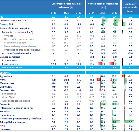 Adicionalmente, el PIB creció 3,6% anual en el 3T25, por encima del 3,2% previsto y del 2,1% del trimestre anterior. Ajustado por calendario y estacionalidad, el crecimiento fue de 3,4% anual, también superior al 2,5% del trimestre previo.