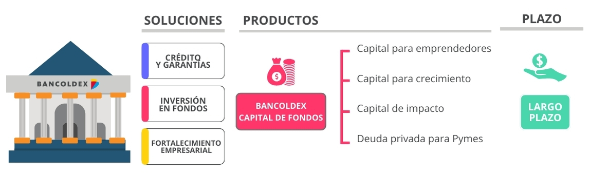 Soluciones financieras vía capital y cuasi capital, en las cuales Bancóldex actúa principalmente como inversionista en fondos de capital, así como promotor de la industria local y regional.