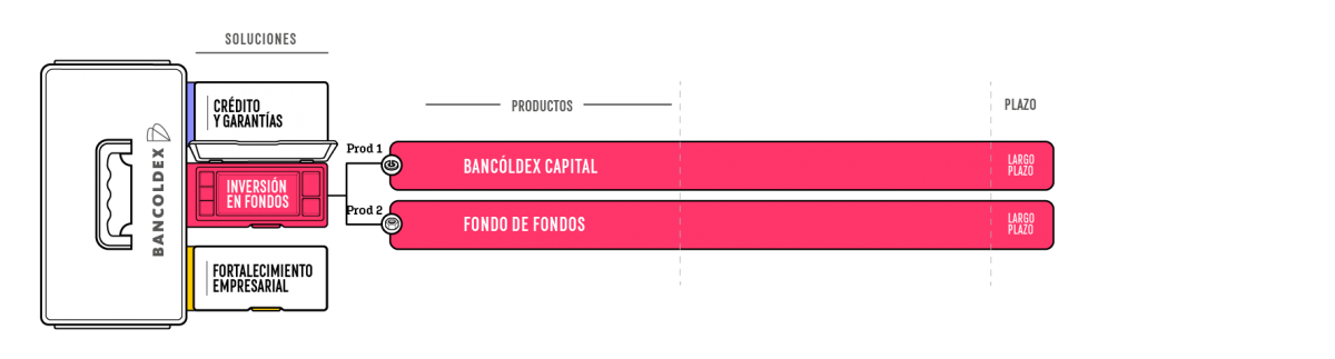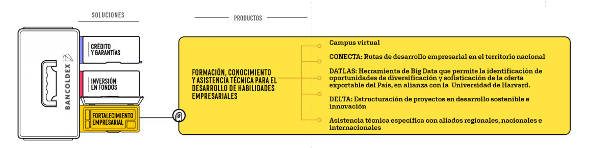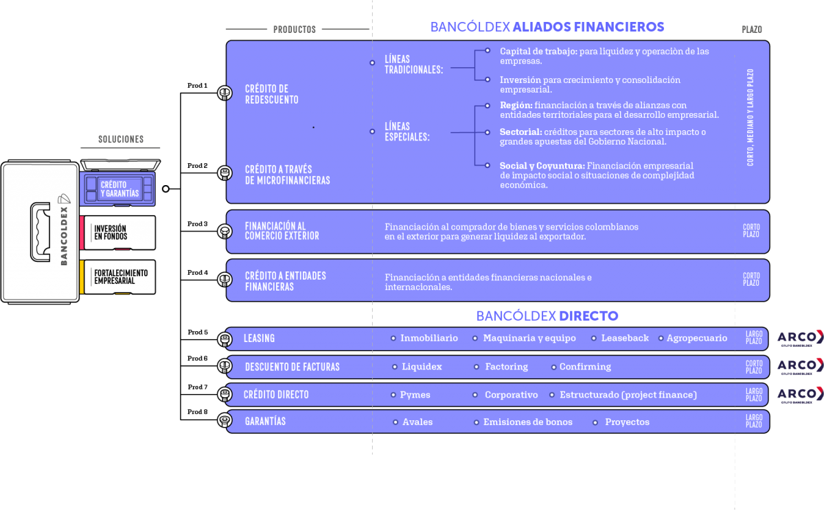 Bancóldex ofrece tres tipos de soluciones para micro, pequeña, mediana y gran empresa, y cada una dispone de productos que se ofrecen a través de nuestros aliados financieros nacionales e internacionales, o de forma directa: