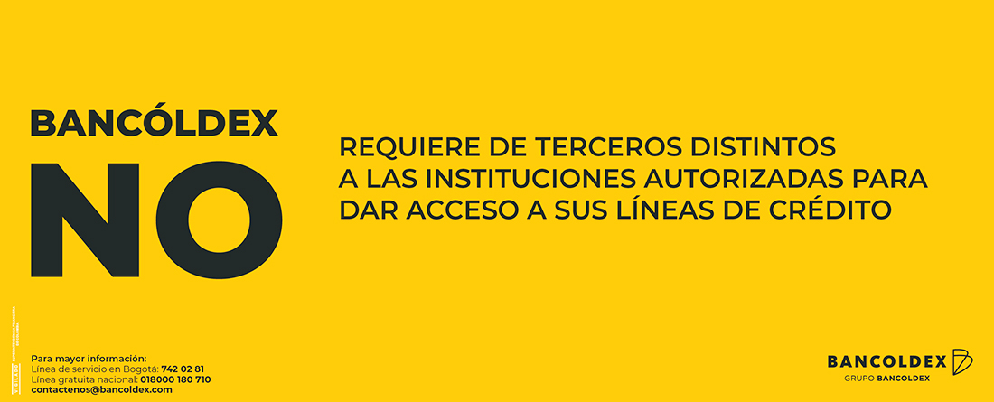 Reiteramos nuestro llamado para que no caiga en manos de personas inescrupulosas que utilizan el nombre de Bancóldex para estafar a los ciudadanos. Para acceder a cualquiera de nuestras líneas de crédito no se requiere de la intervención de terceros distintos a instituciones financieras (establecimientos bancarios, corporaciones financieras, compañías de financiamiento) y entidades especializadas en crédito microempresarial (ONG, cooperativas, fondos de empleados, y cajas de compensación familiar) con cupo disponible en Bancóldex. Consulte estas entidades aquí.